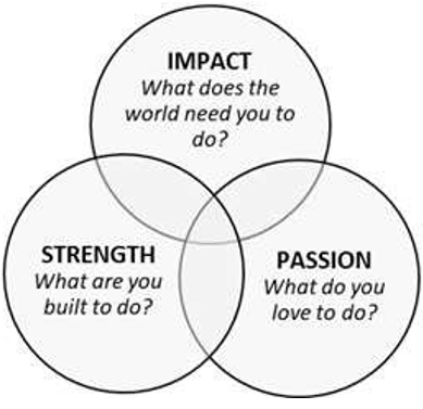 If you imagine these areas of exploration in a Venn diagram-your strengths, your passions, and your potential for meaningful impact in the world-it’s easy to see how a credible, inspiring, and meaningful purpose begins to emerge.