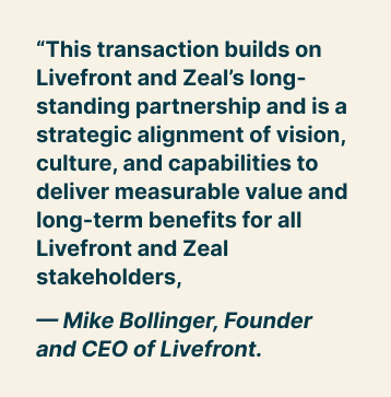 “This transaction builds on Livefront and Zeal’s long-standing partnership and is a strategic alignment of vision, culture, and capabilities to deliver measurable value and long-term benefits for all Livefront and Zeal stakeholders,” said Mike Bollinger, Founder and CEO of Livefront.