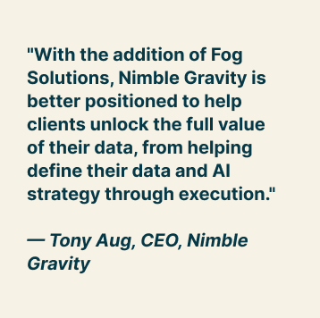 “AI innovation continues to accelerate, organizations need trusted partners to help harness that innovation for tangible business benefit,” said Tony Aug, Nimble Gravity’s CEO. “With the addition of Fog Solutions, Nimble Gravity is better positioned to help clients unlock the full value of their data, from helping define their data and AI strategy through execution.”