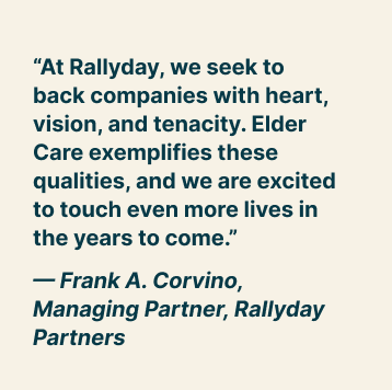 Rallyday Partners is known for backing companies whose purpose and vision set them apart. Frank A. Corvino, Managing Partner at Rallyday Partners, commented, “We are thrilled to partner with Elder Care, a team driven by deep empathy and operational excellence at every level. Their devotion to supporting seniors and their families distinguishes them as true leaders in the home care sector. Their mission is a personal one, that hits close to home for many of us, myself included. At Rallyday, we seek to back companies with heart, vision, and tenacity. Elder Care exemplifies these qualities, and we are excited to touch even more lives in the years to come.”